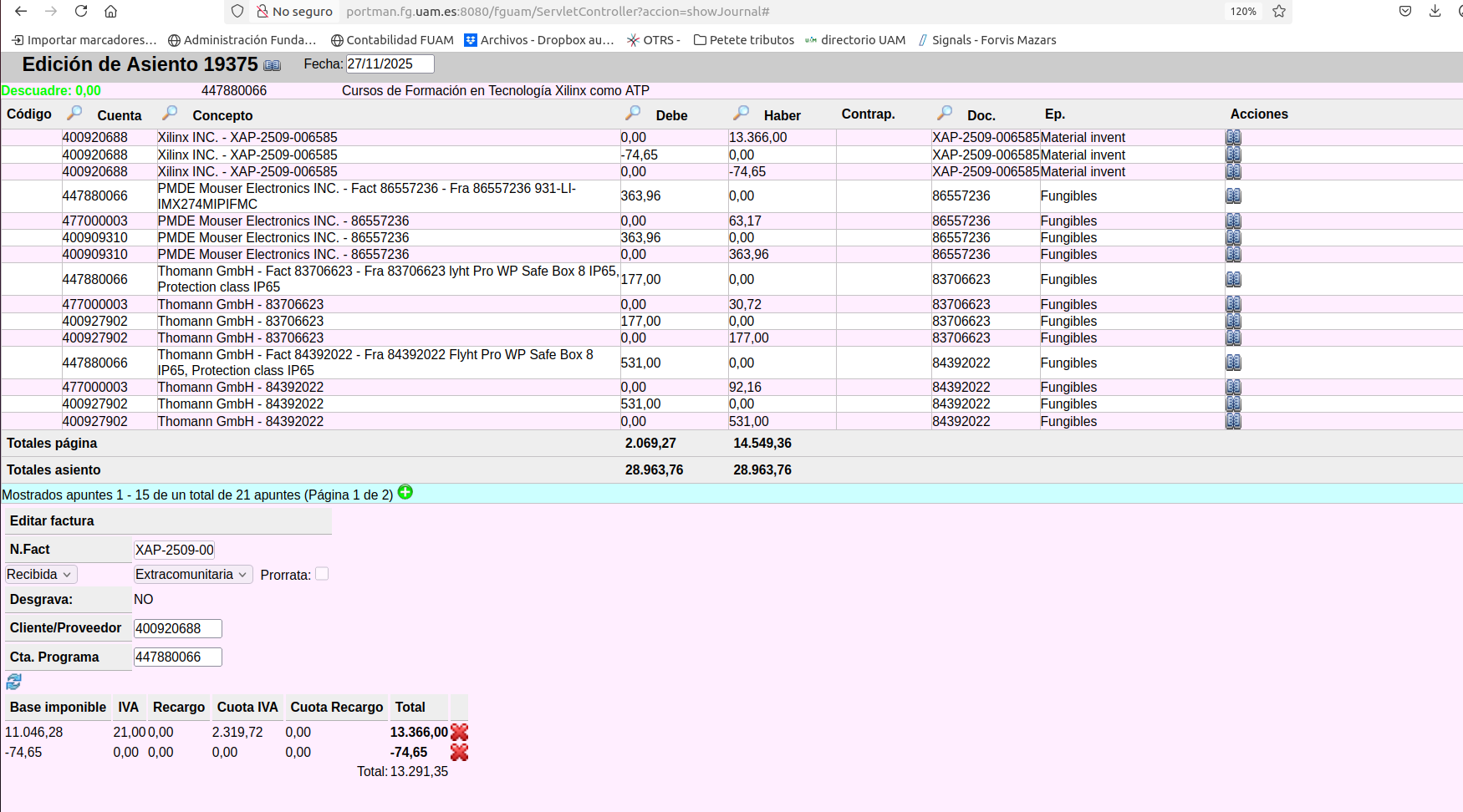 Modificar de extracomunitaria a nacional asiento 19375 ejercicio 2025